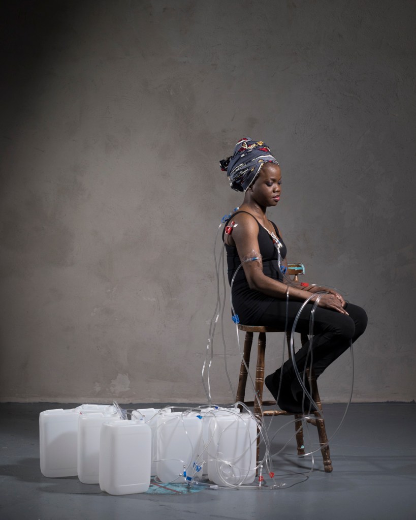 Image Description: A person in a black sleeveless top and trousers, wearing a grey and red head wrap. They are sat on a stool, looking up and holding the dialysis plastic tubing they are attached to. The tubing is linked to the plastic jugs on the floor that surround their feet.