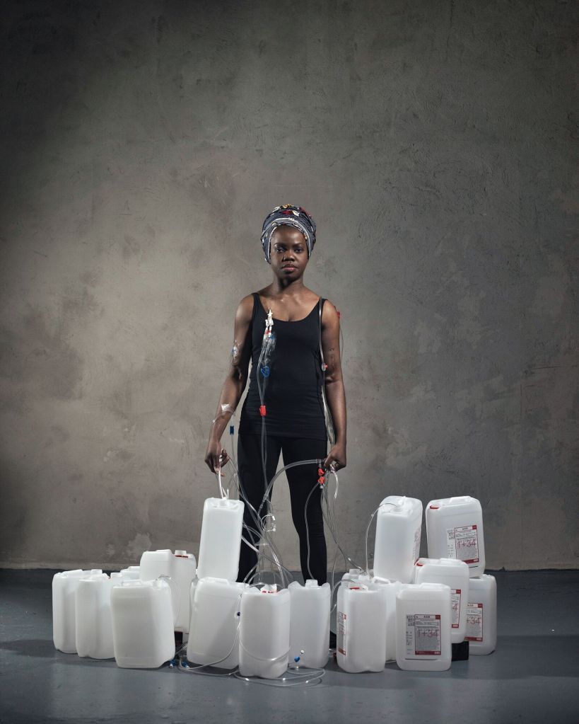 Image Description: A person in a black sleeveless top and trousers, wearing a grey and red head wrap. They are looking forward at the camera, with dialysis tubing connected to her. They are standing behind a collection of empty plastic jugs.