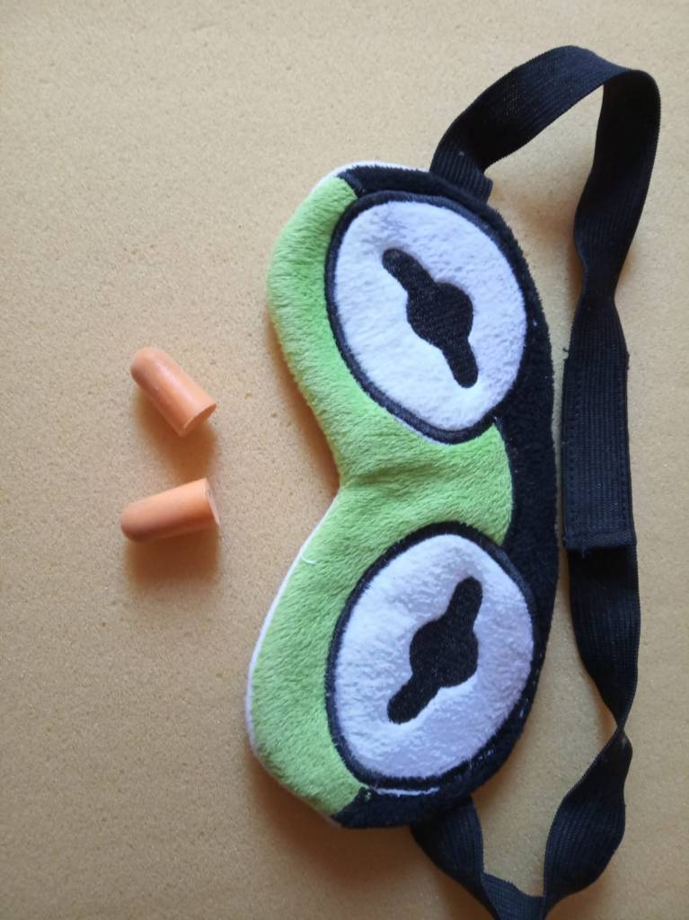 Image Description: A green eye mask with cartoon eyes and a set of ear plugs.