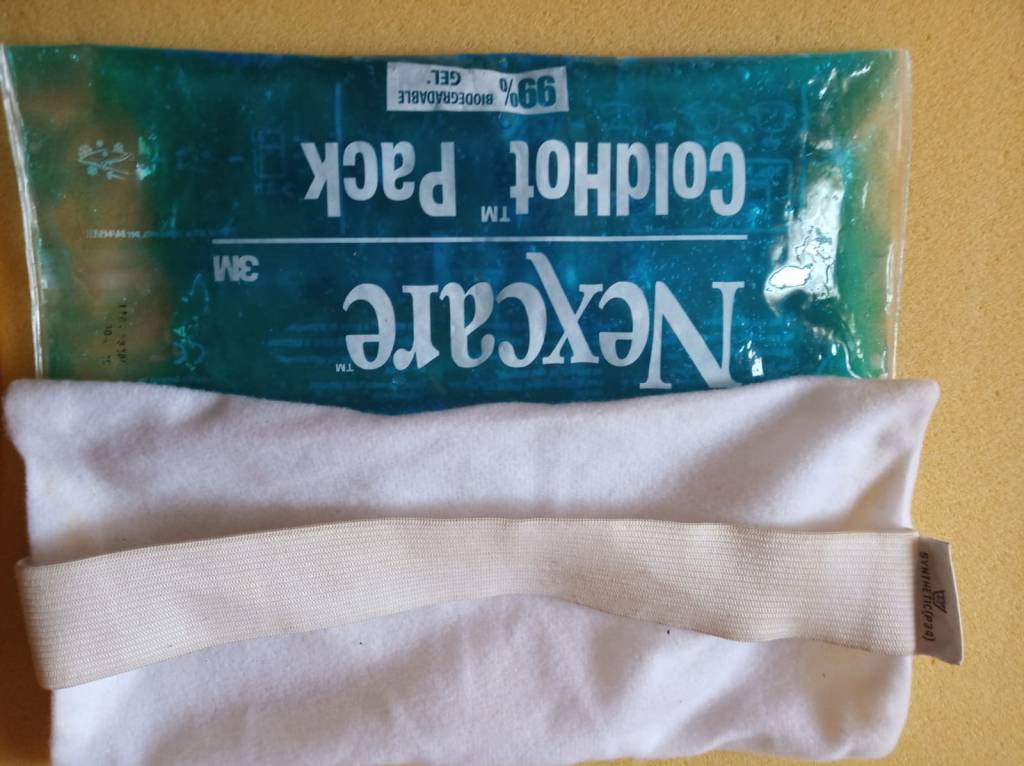 Image Description: A white eye mask next to a blue plastic item, with the text: Nexcare Coldhot Pack.