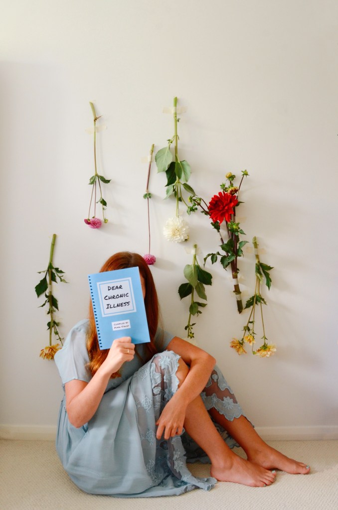 Image Description: Person with red hair in blue clothes sat on the floor holding a book in front of her face with the title “Dear Chronic Illness”. Red, white, pink and yellow flowers are hanging upside down on the wall behind her. One small bouquet of flowers (red and yellow) are attached to the wall the right way up.