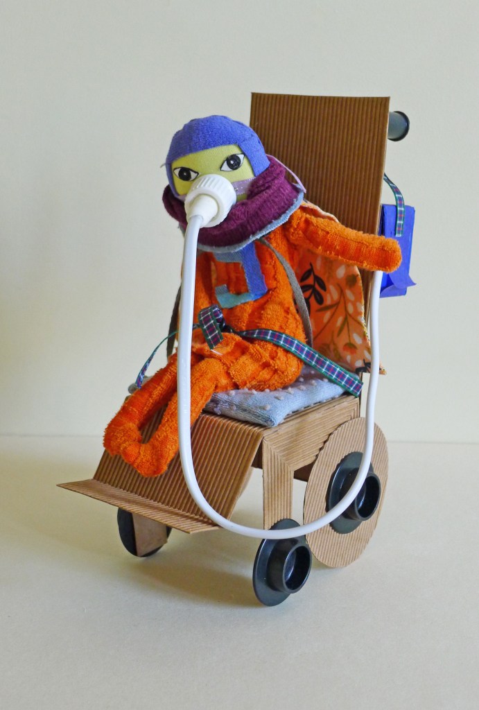 Image Description: Image of an orange figure in a cardboard wheelchair, wearing an oxygen mask.
