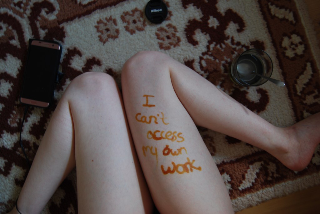 Image Description: Image of a pair of bare legs, bent back at the knees. Written on the write leg is: I can’t access my own work. Next to the legs is a mobile phone, a glass with a spoon and a Nikon camera lens. The person is sat on a white a red carpet.