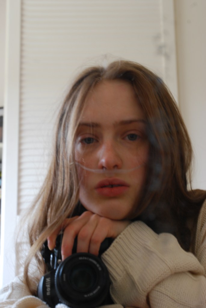 Image Description: Image of a person with long hair and a white sweater, with a tube across their face and attached to their nose. They are holding a Nikon camera and looking directly at the camera.