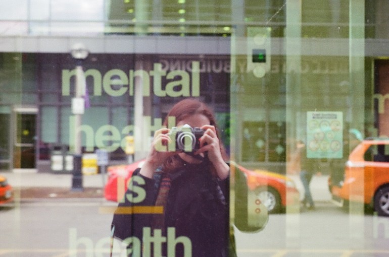 Image Description: Person looking through a camera looking at their reflection in the street in a window that reads Mental health is health.
