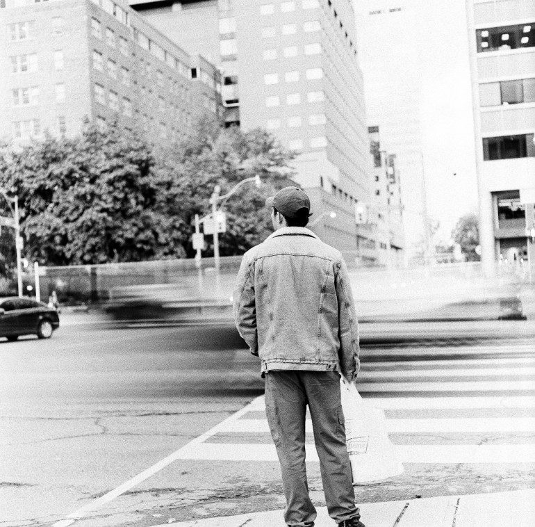 Image Description: Black and white photo. Person in a denim jacket, baseball cap carrying a plastic bag standing at a crosswalk, looking to the left. They are facing a large building with trees in front. There is a blur of movement captured in the photo of a vehicle that has passed quickly.