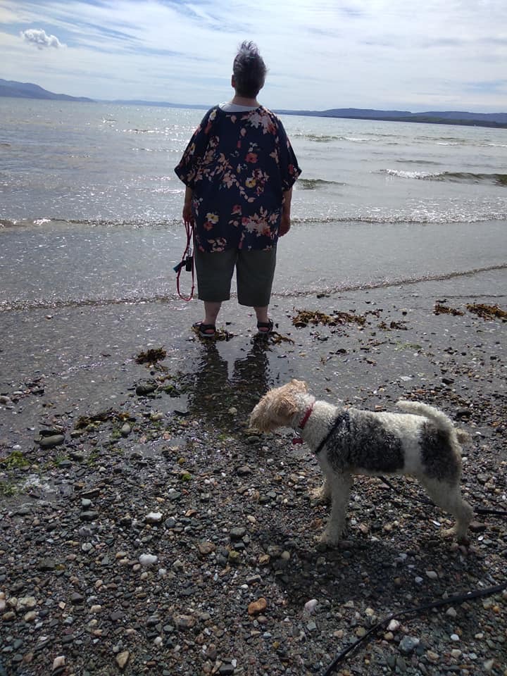 Image Description: Pauline and their dog on the beach, Pauline is facing with their back to the camera